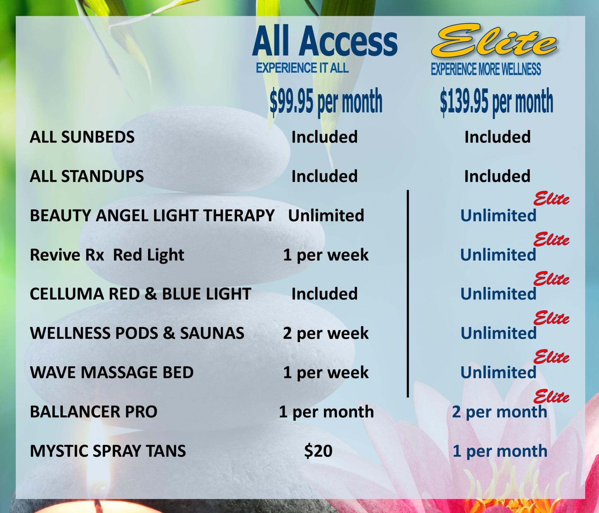 Ask about our ALL ACCESS Membership. Tanning, Cocoon, Hydration Station, Red Light Therapy, Ballancer Pro, Salt Therapy Sauna & Spray Tanning all in one amazingly affordable package.